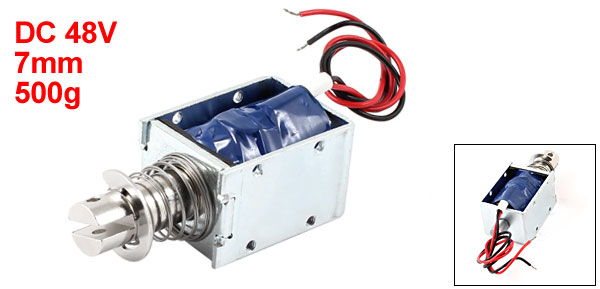 Product Name DC Solenoid Electromagnet Rated Voltage DC 48V Current 1.92A Power 92.16W Type Pull Stroke & Force 7mm, 500g Plunger Hole Dia. 3mm/0.12" Plunger Dia. 12mm/0.47" Total Size 74 x 29 x 24mm/2.9" x 1.14" x 0.94"(L*W*H) Cable Length 20cm/7.8" Material Metal, Electronic Parts Net Weight 153g Package Content 1 x DC Solenoid Electromagnet - Reviews