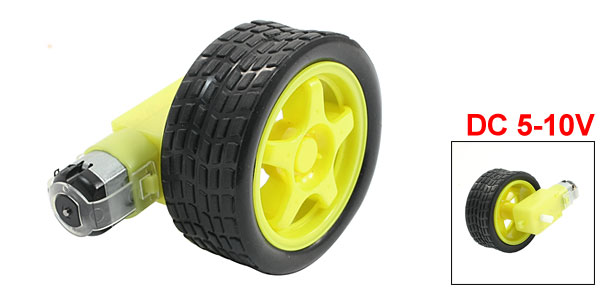 Product Name DC Geared Motor Rated Voltage DC 5-10V Reduction Ratio 48:1 Rubber Tire Wheel Size 65 x 26mm/2.5" x 1"(D*T) Motor Size 6.5 x 2.3 x 1.8cm/2.5" x 0.9" x 0.7"(L*W*T) Color Yellow, Black Net Weight 70g Package Content 1 x DC Geared Motor w Plastic Tire Wheel