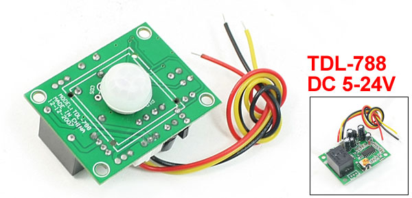 Product Name Motion Sensor Module Model TDL-788 Working Voltage DC 5-24V Output Current 5mA Sensor Range 3-5M Time Range 15s Total Size 4.3 x 3.3 x 2.5cm/1.7" x 1.3" x 1"(L*W*T) Cable Length 15.5cm/6.1" Material Plastic, Electronic Part Color Green, White Net Weight 15g Package 1 x Motion Sensor Module - Reviews