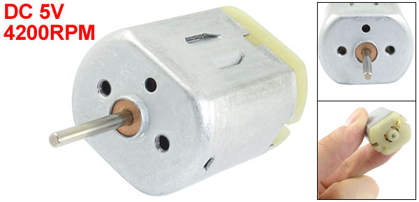 Product Name Motor Rated Voltage DC 5V Rated Current 0.15A Speed 4200±630RPM Shaft Diameter 2mm/ 0.078" Shaft Length 15mm/ 0.59" Body Size 24 x 18mm/ 0.94" x 0.71" (L*W) Total Length 50mm/ 2" Main Color Silver Tone Material Metal Weight 35g Package 1 x Motor - Reviews