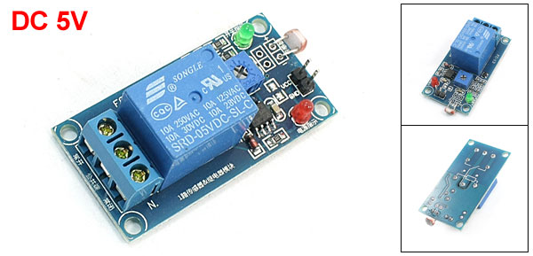 Product Name Photosensitive Resistance Relay Module Chip SRD-05VDC-SL-C Working Voltage DC 5V Channel 1 Load Power 10A 250/125AVC 30/28VDC Total Size 50 x 26mm/ 2" x 1" (L*W) Materials PCB, Electric Parts Main Color Blue Net Weight 15g Package Content 1 x Photosensitive Resistance Relay Module - Reviews