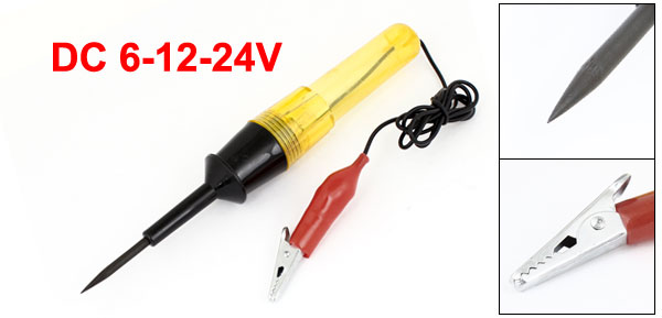 Product Name Car Circuit Voltage Tester Material Plastic, Metal Voltage DC 6V-12-24V Total Size (Approx.) 190 x 27mm/7.5" x 1" (L*D) Clip Max. Clamping Size 9mm/0.35" Cable Length(Approx.) 72cm/28.3" Handle Color Clear Yellow, Black Net Weight 37g Package Content 1 x Car Circuit Voltage Tester