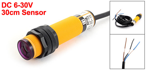 Product Name Photoelectric Switch Sending Light Infrared Rays Output Form PNP NO 3 Wires Voltage DC 6-30V Current 300mA Sensory Distance 30cm Sensor Head Diameter 17mm/0.67" Body Size 23 x 75mm/0.87" x 3.0"(D*L)