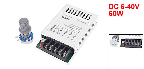 Product Name DC Motor Speed Controller Voltage DC 6-40V Power Range 60W Body Dimension 80 x 48x 20mm/3.1" x 1.9" x 0.8"(L*W*T) Potentiometer Size 27 x 18mm/1.1" x 0.7"(L*D) Main Color Silver Tone Weight 65g Package Content 1 x DC Motor Speed Controller