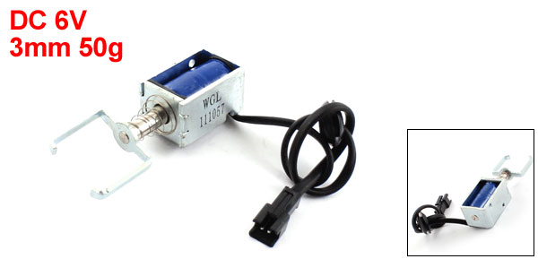 Product Name DC Solenoid Electromagnet Model TF0626L-110V400 Rated Voltage & Current DC 6V 0.46A±20% Power 2.81W±30% Stroke & Force 3mm, 50g Action Form Pull Type Connection Rates 50% Plug Type Male JST SM 2Pin Connector Body Size 30 x 19 x 16mm/ 1.2" x 0.78" x 0.63"(L*W*H) Plunger Size 49 x 24 x 6mm/ 2" x 0.95" x 0.24"(L*W*D) Cable Length 22cm/ 8.7" Material Metal, Electronic Parts Net Weight 51g Package Content 1 x DC Solenoid Electromagnet - Reviews