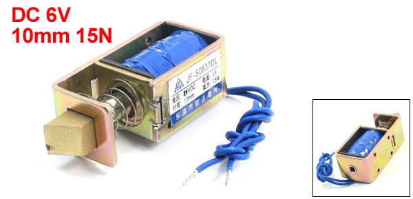 Product Name Door Solenoid Model JF-0837DL Material Metal, Electronic Parts Color Gold Tone Rated Voltage DC 6V Rated Stroke & Force 10mm, 15N
