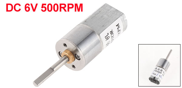 Product Name DC Geared Motor Rated Voltage DC 6V Output Speed 500RPM Mounting Screw Hole Diameter 2.6mm/0.1" Gearbox Size 16 x 13mm/0.63" x 0.51"(D*H) Shaft Size 3 x 20mm/ 0.12" x 0.8"(D*L) Body Length 32mm/ 1.3" Total Length 55mm/ 2.2" Main Color Silver Tone Material Metal Net Weight 23g Package 1 x DC Geared Speed Reduce Motor - Reviews