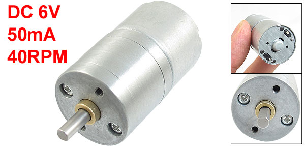 Product Name Gear Motor Rated Voltage DC 6V Rated Current 50mA Speed 40RPM Shaft Diameter 4mm/ 0.16" Shaft Length 11mm/ 0.43" Body Part Diameter 25mm/ 0.98" Gear Box Diameter 24mm/ 0.94" Total Length 60mm/ 2.4" Main Color Silver Tone Material Metal Weight 70g Package 1 x Gear Motor - Reviews
