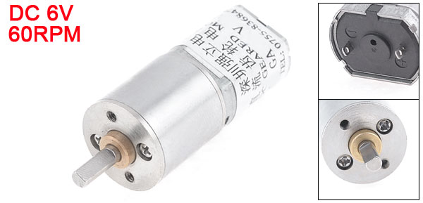 Product Name DC Geared Motor Rated Voltage DC 6V Output Speed 60RPM Shaft Diameter 3mm/ 0.24" Gearbox Part Size 16 x 16mm/ 0.6" x 0.6"(D*L) Motor Part Size 15 x 18mm/ 0.6" x 0.7"(D*L) Total Length(Approx) 45mm/ 1.8" Material Metal, Electronic Parts Color As Picture Shown Weight 23g Package Content 1 x DC Geared Motor - Reviews