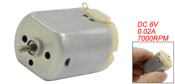 Product Name DC Motor Rated Voltage DC 6V Rated Current 0.02A Speed 7000RPM Shaft Diameter 2mm / 0.078" Shaft Length 7mm / 0.28" Body Size 30 x 25 x 20mm / 1.18" x 1" x 0.78"(L*W*T) Total Length 45mm / 1.77" Main Color Silver Tone Material Metal Weight 37g Package 1 x DC Motor - Reviews