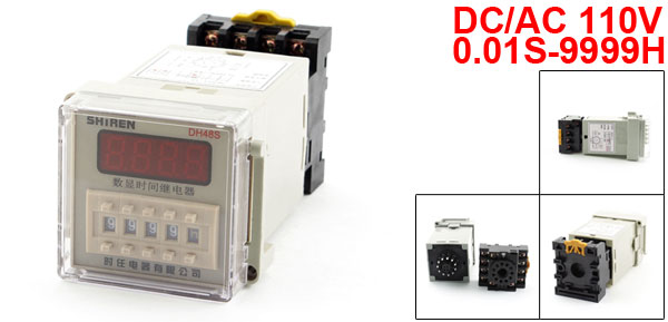 Product Name Time Relay w Base Socket Model Number DH48S-11 Contact Capacity AC 250V 5A Rated Voltage DC/AC 110V Contact Type DPDT, 2NO 2NC Number of Terminals 11 Pins Time Range 0.01S-9999H External Material Plastic, Metal Fixing Hole Dia 3mm/0.12" Mounted Size 51 x 45mm/2.1" x 1.8"(L*W) Total Size 110 x 58 x 48mm /4.3" x 2.3" x 1.9"(L*W*H) Total Weight 192g Net Weight 172g Package Content 1 x Time Relay w Base Socket