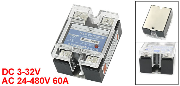 Product Name Solid State Relay Control DC 3-32V Output AC 24-480V 60A 50/60Hz Contact Type NO(Normal Open) Screw Terminal 4 Phase 1 Fixing Hole Dia 4.5mm/0.14" Fixing Center Distance 50mm/2" Size (Approx.) 59 x 45x 32mm/ 2.4" x 1.8" x 1.3"(L*W*T)