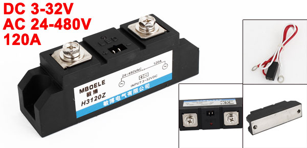 Product Name Solid State Relay Model No. H3120Z Control Method DC to AC Current 120A Input Voltage 3-32VDC Load Voltage 24-480VAC Relay Size (Approx.) 9.3 x 2.5 x 3.8cm / 3.7" x 0.98" x 1.5" (L*W*H ) Wire Length 26.8cm / 10.6" Material Metal, Plastic Main Color Black, Red, Silver Tone, White Weight 147g Package Content 1 x Solid State Relay
