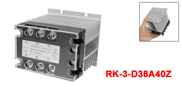 Product Name Solid State Relay Model No. RK-3-D38A40Z Control DC 5-32V Load AC 380V, 40A Size (Approx.) 10.5 x 10 x 12cm/ 4.1" x 3.9" x 4.7"(L*W*H) Color Black, Silver Tone Material Aluminum, Plastic Weight 742g Package Content 1 x Solid State Relay