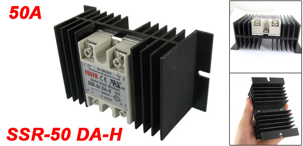 Product Name Solid State Relay Model No. SSR-50 DA-H Material Metal, Aluminum, Plastic Load Current 50A Load Voltage 90-480V AC Control Voltage 3-32V DC Mounting Hole Diameter 5mm / 0.2" Total Size (Approx.) 126 x 70 x 52mm / 5.0" x 2.8" x 2.0" (L*W*H) Weight 330g Package Content 1 x Solid State Relay - Reviews