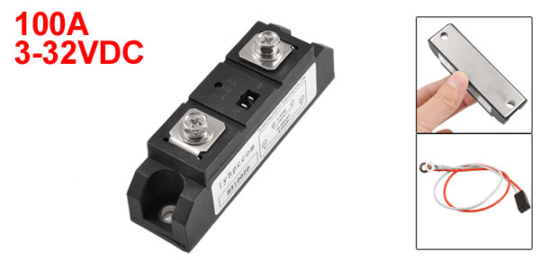 Product Name Solid State Relay Model No. H3100ZD Control Method DC to AC Current 100A Input Voltage 3-32VDC Load Voltage 75-480VAC Relay Size (Approx.) 9.3 x 2.5 x 3.8cm / 3.7" x 0.98" x 1.5" (L*W*H ) Wire Length 26.8cm / 10.6" Material Metal, Plastic Main Color Black, Red, Silver Tone Weight 130g Package Content 1 x Solid State Relay