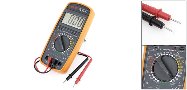 Other Measure Function Diode & On-Off, hFE Overload Protection Fuse Power By 9VN60A ,6F22,1604 battery (not included) Main Color Black & Orange Mateiral Plastic & Metal Test Leads Total Length ~70cm/ 28" Multimeter Size 19.7 x 9.1 x 3.3cm/ 7.8" x 3.6" x 1.3" (L*W*T) Net Weight 300g