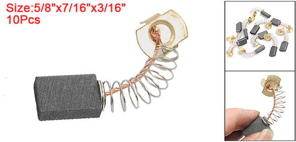 DetailsDC Device 5/8" x 7/16" x 3/16" Carbon Brushes 5 Pairs  Product Name Motor Carbon Brush Fitness Generic Electric Motor Carbon Brush Size 5/8" x 7/16" x 3/16" (L * W * H) Total Length(Approx) 3.5cm/1.4" (When Spring Stretching) Net Weight 29g Package Content 10 x Motor Carbon Brush