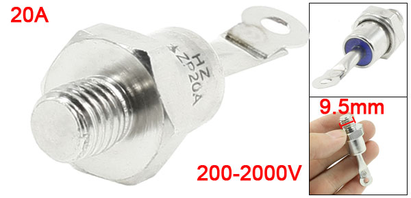 Product Name Rectifier Diode Model ZP20A Average Forward Current 20A Repetitive Peak Reverse Voltage(VRRM) 200-2000V Thread Diameter 9.5mm / 0.37" Body Size 47 x 18mm / 1.8" x 0.7"(L*W) Color Silver Tone Material Metal Net Weight 20g Package Content 1 x Rectifier Diode - Reviews