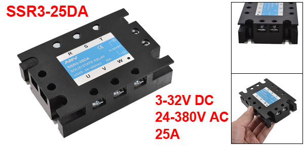 Product Name 3 Phase Solid State Relay Model No. SSR3-25DA Control Method DC to AC Input Voltage 3-32V DC Output Current 25A Output Voltage 24-380V AC Total Size (Approx.) 10.3 x 7.3 x 2.8cm / 4" x 2.9" x 1.1" (L*W*H ) Material Metal, Plastic Color Black, Silver Tone Weight 279g Package Content 1 x 3 Phase Solid State Relay - Reviews