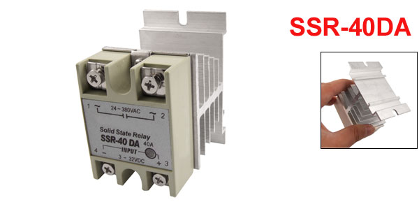 DetailsDC to AC Screw Terminals Single Phase Solid State Relay 40A 3-32V 24-380V w heat sink  Product Name Solid State Relay + Heat Sink Model SSR-40DA Material Metal, Aluminum, Plastic Input 3-32V DC Output 24-380V AC Rated Current 40A Total Size (Approx.) 8 x 5 x 7.3cm / 3.1" x 1.9" x 2.8" (L * W * H ) Color As Picture Shown Weight 195g Package Content 1 x Solid State Relay + Heat Sink