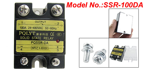 Product Name Solid State Relay Model No. SSR-100DA Input 3-32V DC Output 24-480V AC, 50-60Hz, 100A Size (Approx.) 4.4 x 5.7 x 3.1cm / 1.7" x 2.2" x 1.2" (L*W*T) Hole in Base Dia 0.44cm / 0.173" Color As Picture Shown Material Metal, Resin, Electric Parts Weight 113g Package Content 1 x Solid State Relay 2 x Fixed Screw - Reviews