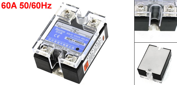 Product Name Solid State Relay Model No. BEM-14860DA Current & Frequency 60A, 50/60Hz Output Voltage 24-480VAC Control Voltage 3-32VDC Mounting Hole Diameter 4.5mm / 0.18" Total Size (Approx.) 58 x 45 x 32mm / 2.3" x 1.8" x 1.26" (L*W*T) Material Metal, Plastic, Electronic Parts Net Weight 116g Package Content 1 x Solid State Relay - Reviews