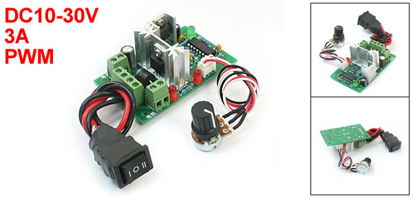 Product Name DC Motor Speed Controller Model CCM2U6 Input Voltage DC10-30V Rated Current 3A Modulation Type PWM Power 120W PWM Frequency 500Hz PWM Pulse Width Speed Range 5%-95% Mounting Hole Dia. 3.5mm/ 0.14" Size 74 x 47 x 28mm/2.9" x 1.9" x 1.1"(L*W*H) Wire Length 20cm/ 7.9", 14cm/ 5.5" Material Metal, Aluminum, PCB Main Color Black, Silver Tone, Green Wieght 71g Package Content 1 x Reversing Switch Adjustable DC Motor Speed Controller - Reviews
