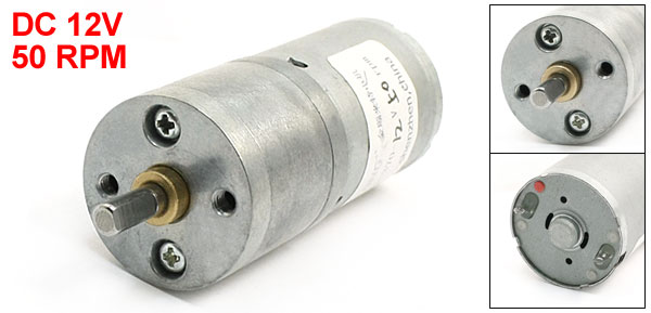 Product Name Gear Motor Rated Voltage DC 12V Rated Speed 50 RPM Overload Current 240mA Reduction Ratio 171 Torque 4.78kg.cm Shaft Size 10 x 4mm/ 0.39'' x 0.16''(L*D) Motor Body Size 3 x 2.4cm/1.2" x 0.95"(L*D) Gear Box Size 2.5 x 2.5cm/1" x 1"(L*D) Total Length(Included Pin) 7.3cm/2.9" Material Metal, Electronic Parts Color Silver Tone Weight 95g Package Content 1 x Gear Motor - Reviews