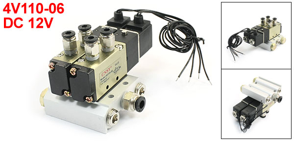 Product Name Solenoid Valve Set Model 4V110-06 Working Pressure 1.5-8Kgf/cm2 Working Voltage DC 12V Position & Way Number 2 Position 5 Way Base Size 7.8 x 5.8 x 2cm/3.1" x 2.3" x 0.78"(LW*T) Inlet/Outlet Quick Fitting Inner Dia 4mm