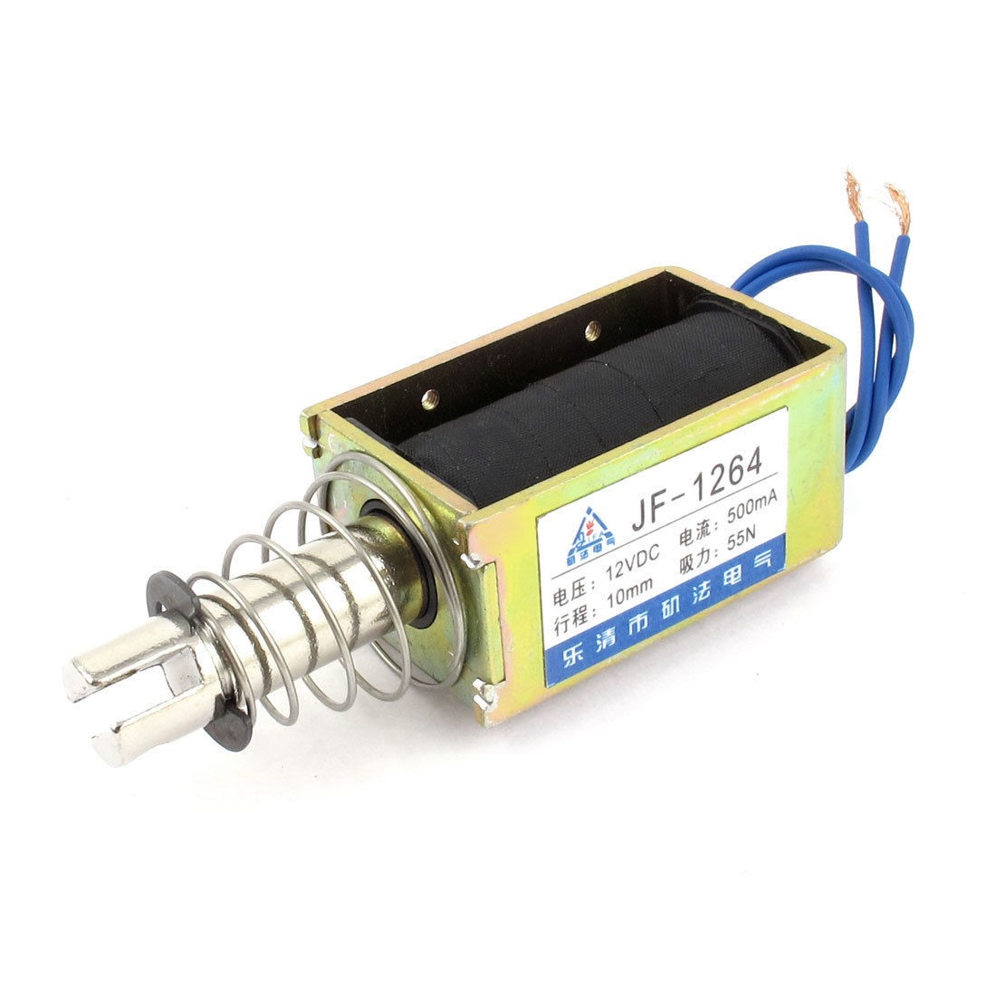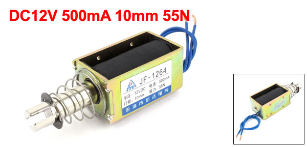 Force 55N Net Weight 334g Country of Manufacture CHINA Cable Length 17cm/ 0.7 inches Model JF-1264 Package Content 1 x DC Solenoid Electromagnet Stroke 10mm Rated Voltage & Current DC 12V 500mA Material Metal, Electrical Part Power On Type Continuous Body Size 63 x 38 x 30mm/ 2.5 x 1.5 x 1.2 inches (L*W*H) - Reviews