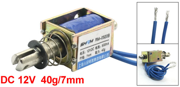 Product Name DC Solenoid Electromagnet Model RM-0520B Rated Voltage DC 12V Type Pull Push Rated Current 500mA Force & Stroke 40g/7mm
