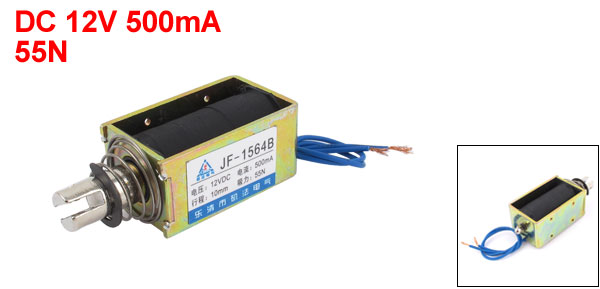 Force 55N Net Weight 337g Country of Manufacture CHINA Model JF-1564B Cable Length 17cm/ 0.7 inches Package Content 1 x DC Solenoid Electromagnet Stroke 10mm Rated Voltage & Current DC 12V 500mA Material Metal, Electrical Part Power On Type Continuous Body Size 63 x 38 x 30mm/ 2.5 x 1.5 x 1.2 inches (L*W*H) - Reviews