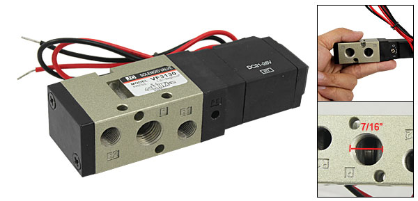 Product Name Solenoid Valve Type 5 Way 2 Position Voltage DC21-26V Operating Pressure 1.5-9kgf / cm² NPT Diameter 7/16" Total Size (Approx.) 11.2 x 3.5 x 2.5cm / 4.4" x 1.4" x 0.98"(L*W*T) Cable length 30cm / 11.8" Material Metal, Plastic Color As Picture Shown Weight 204g Package Content 1 x Solenoid Valve - Reviews