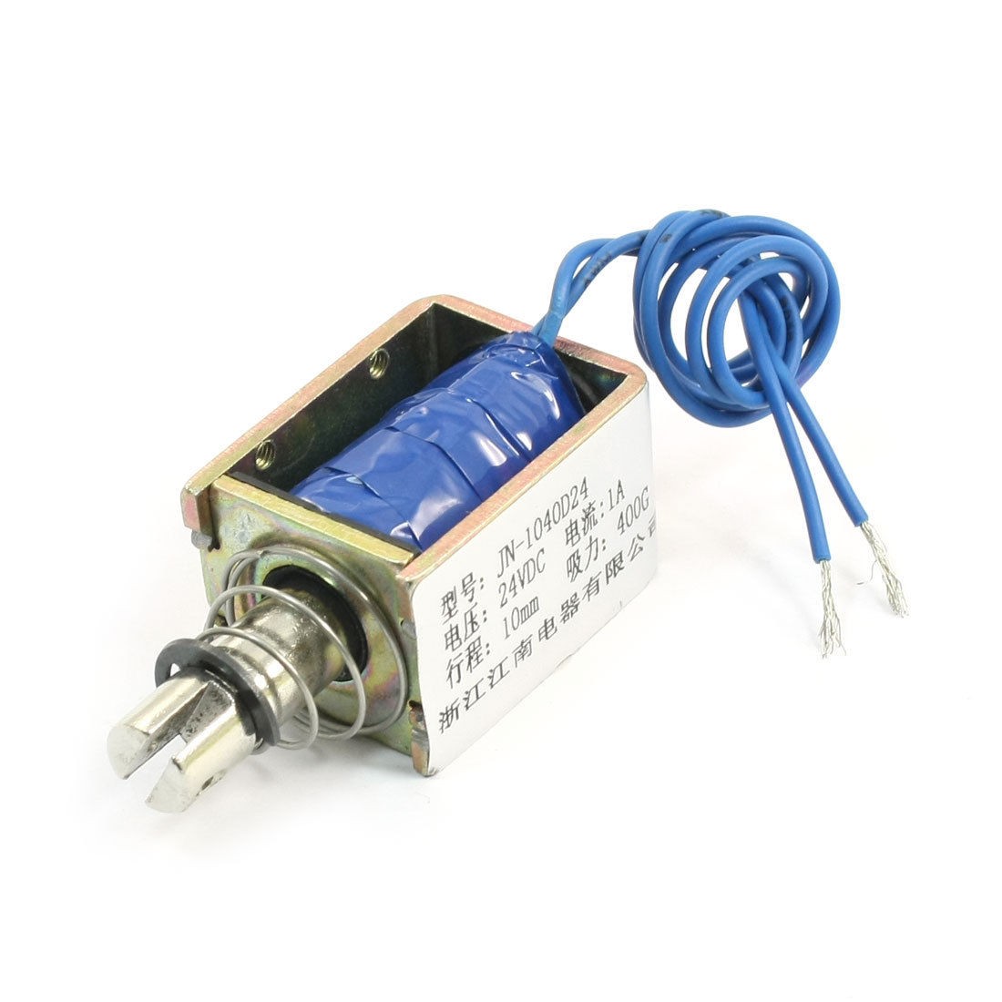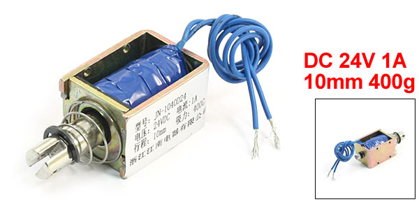 Product Name DC Solenoid Electromagnet Rated DC 24V 1A Type Pull Push Force & Stroke 10mm 400g Body Size 40 x 30 x 25mm/1.6" x 1.2" x 1"(L*W*H) Plunger Bar Size 70 x 4mm/2.8" x 0.16"(L*D) Screw Hole Diameter 2.5mm/0.1" Plunger Hole 3mm/0.12" Wire Length 22cm/8.7" Material Metal, Electronic Parts Weight 134g Package Content 1 x DC Solenoid Electromagnet - Reviews