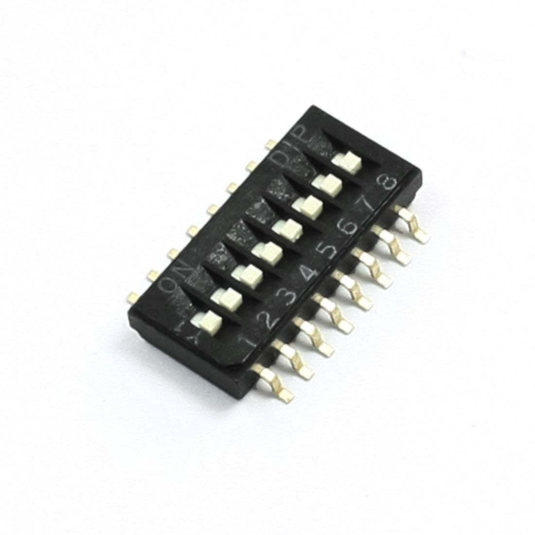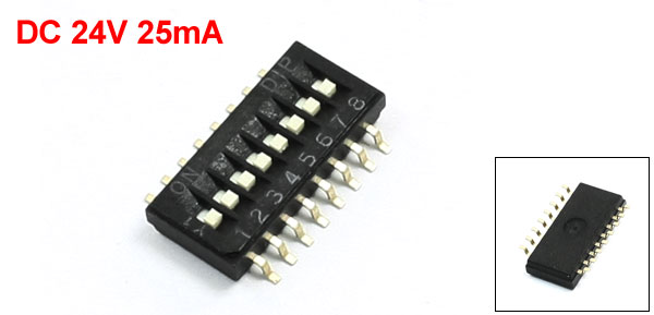 Product Name DIP Switch Type SMD Type Features 8 Positions (16Pin) Pitch 1.27 mm / 0.05" Switching Rating DC24V, 25mA Each Size 12 x 8 x 2.5mm / 0.47" x 0.31" x 0.1" (L*W*H) Main Material Plastic, Metal Color Gold Tone, Black Net Weight 1g Package Content 1 x DIP Switch - Reviews