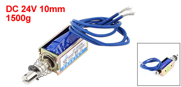Brand DMiotech Country of Manufacture CHINA Model JF-0530B Type Pull Material Metal, Electronic Parts Plunger Bar Size 57 x 6mm/2.2" x 0.24"(L*D) Wire Length 22cm/8.7" Screw Hole Diameter 2mm/0.08" Net Weight 31g Rated DC 24V 300mA Package Content 1 x DC Solenoid Electromagnet Force /Stroke 10mm /1500g 3.3lb Body Size 30 x 15 x 14mm/1.2" x 0.6" x 0.55"(L*W*H) - Reviews