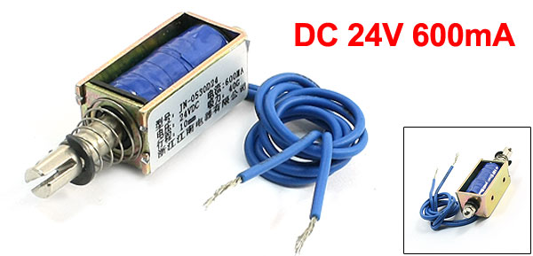 Product Name DC Solenoid Electromagnet Rated Voltage DC 24V 600mA Type Pull Force & Stoke 10mm 40g Body Size 30 x 15 x 14cm/1.2" x 0.6" x 0.55"(L*W*T) Plunger Bar Size 57 x 3mm / 2.2" x 0.12" (L*D) Screw Hole Diameter 2.5mm / 0.1" Total Length 57mm / 2.2" Cable Length 22cm / 8.7'' Material Metal, Electronic Parts Color Silver Tone Weight 32g Package Content 1 x DC Solenoid Electromagnet  - Reviews