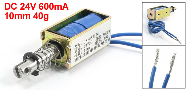 Product Name DC Solenoid Electromagnet Rated DC 24V 600mA Type Pull Force & Stroke 10mm 40g Body Size 30 x 15 x 13mm/1.2" x 0.6" x 0.51"(L*W*H) Plunger Bar Size 35 x 6mm/1.4" x 0.24"(L*D) Screw Hole Diameter 2.5mm/0.1" Plunger Hole 2mm/0.08" Wire Length 22cm/8.7" Material Metal, Electronic Parts Weight 31g Package Content 1 x DC Solenoid Electromagnet - Reviews