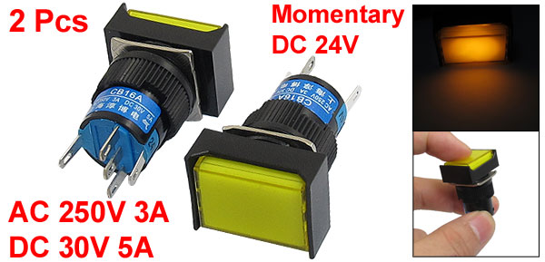 DC24V Lamp 1NO 1NC Momentary Yellow Cap Rectangular Push Button Switch 2Pcs