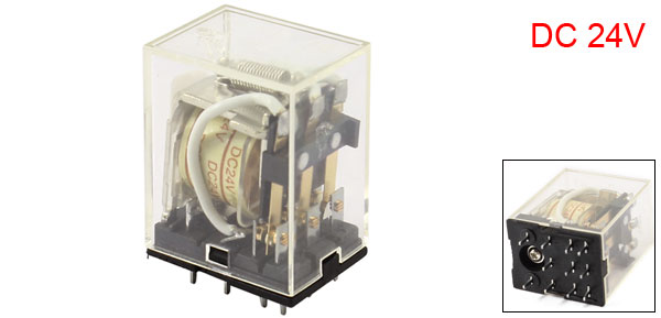 Product Name Electromagnetic Relay Coil Voltage DC 24V Contact Capacity AC 5A 250V ;DC 30V Type 3PDT; 3NO 3NC Pin Quantities 11 Pin Size 4.5 x 1.4mm/0.18" x 0.55"(L*W) Body Size (Approx.) 3.5 x 2.1 x 2.7cm/1.4" x 0.8" x 1"(L*W*H) Shell Material Plastic Main Color Clear, Black Net Weight 33g Package Content 1 x Electromagnetic Relay - Reviews