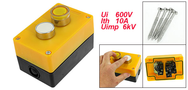 DetailsDC24V Yellow Indicator Light White Momentary Push Button Switch Station NO N/O  Product Name Push Button Switch Station Material Plastic, Metal Ui 600V Ith 10A Uimp 6kV Working Voltage AC 240V 3A Light Voltage DC 24V Action Type Momentary Push Button Contact Type NO Overall Size(not include button) 10.8 x 7 x 6.4cm/ 4.3" x 2.8" x 2.5" (L*W*H) Button Diameter 2.8cm/ 1.1" Mounting Hole Diameter 5mm/ 0.2" Color Yellow, White, Black, Orange Push Button Light Color Yellow Weight 244g Package Content 1 x Push Button Station