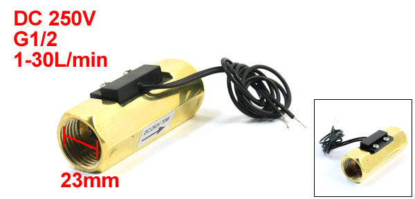 Product Name Water Flow Switch Model SEN-CL21N Type Magnetic Type Max Switch Voltage DC250V Max Contact Rating 70W Max Switch Current 10mA Hole Inner Diameter(Each End) G1/2 Working Range 1-30L/min Max. Pressure 1.75Mpa Total Size 62 x 23mm/ 2.4" x 0.91"(L*W) Cable Length 34cm/ 13.4" Main Material Brass Color Gold Tone, Black Weight 137g Package Content 1 x Water Flow Switch - Reviews