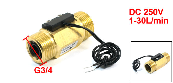 Product Name Water Flow Switch Model SEN-ZL43W Type Gravity Type Max Switch Voltage DC250V Max Contact Rating 70W Max Switch Current 10mA Male Thread Dia (Each End) G3/4 Working Range 1-30L/min Max. Pressure 1.75Mpa Total Size 62 x 27mm/ 2.4" x 1.1"(L*W) Cable Length 33cm/ 13" Main Material Brass Color Gold Tone, Black Weight 155g Package Content 1 x Water Flow Switch - Reviews