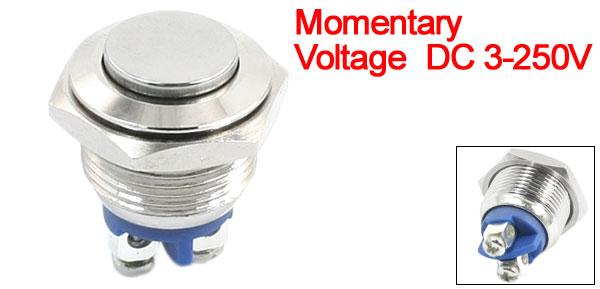 Item Name Push Button Switch Action Type Momentary Type Head Shape High Flat Head Contact SPST Voltage DC 3-250V Terminals Number 2 Thread Diameter 16mm/0.6" Total Size 24 x 19mm/0.95" x 0.75" (L*Max.W) Material Metal, Plastic, Electric Parts Housing Color Silver Tone Net Weight 14g Package Content 1 x Push Button Switch - Reviews