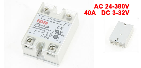Product Name Solid State Relay Type SSR-40DA Rated Load Current 40A Input DC 3-32V Output AC 24-380V Total Size (Approx.) 6.3 x 4.5 x 2.5cm/ 2.5" x 1.8" x 1"(L*W*T) Material Plastic, Electric Part Color Gray, Silver Tone Weight 100g Package Content 1 x Solid State Relay