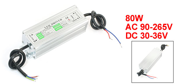 Product Name Waterproof LED Driver Fit for 80W LED Strip Input AC 90-265V 1A 50/60HZ Output DC 30-36V 2400mA(±5%) Efficiency >85% Power Factor 0.98 Protection Rank IP67 Hole Dia 4.5mm/0.18" Fixing Hole Center Distance 14.2 x 2.5cm/5.6" x 1"(L*W) Body Size 15.5 x 5 x 4cm/6.1" x 2" x 1.6"(L*W*H) Total Length 78.5cm/31" Shell Material Aluminum, Plastic Main Color Silver Tone, Black Net Weight 477g Package Content 1 x Waterproof LED Driver - Reviews