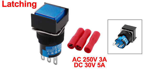 Item Name Square Head Push Button Switch w Crimp Connector Model CB16A Contact Type SPDT(1NO 1NC) Action Type Latching Pin Number 3 Voltage, Current AC 250V 3A