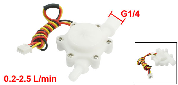 Product Name Water Flow Sensor Flow Range 0.2-2.5 L/min Voltage & Current DC3V-18V, 10mA Standard DC5V Pulse Duty Factor 50 % High Level of Pulse Output >4.5V (DC5V) Low Level of Pulse Output <0.5V (DC5V) Max Pressure 0.8Mpa Insulation Performance 100MΩ Connector Type JST Connector Main Material Plastic Total Size 63 x 40 x 22mm / 2.5" x 1.6" x 0.87"(L*W*T) Outlet Diameter 6mm/0.24" Male Thread Port Diameter G1/4 Cable Length 32cm / 12.6" Weight 26g Package Content 1 x Water Flow Sensor - Reviews