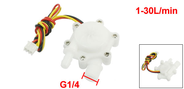 Product Name Water Flow Sensor Model SEN-HW06FB Flow Range 1-30L/min Working Voltage & Current DC3V-18V, 10mA Rated Voltage DC5V Pulse Duty Factor 50 % High Level of Pulse Output >4.5V (DC5V) Low Level of Pulse Output <0.5V (DC5V) Max Pressure 1.75Mpa Insulation Performance 100MΩ Connector Type 3Pin JST Connector Main Material Plastic Total Size 55 x 40 x 22mm / 2.2" x 1.6" x 0.87"(L*W*T) Inlet Diameter 6mm/0.24" Male Thread Port Diameter G1/4 Cable Length 32cm / 12.6" Body Color White Weight 25g Package Content 1 x Water Flow Sensor - Reviews